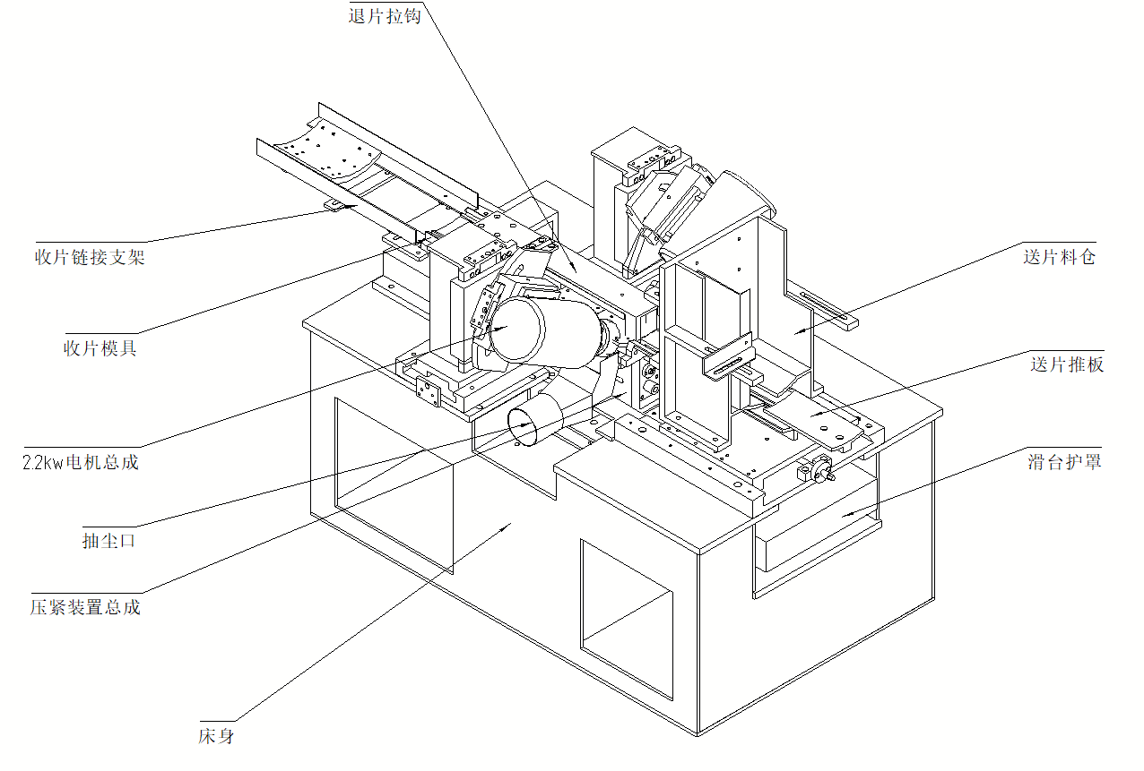 售后保證本機主要由機架、模具部件、定位裝置總成、進給滑臺裝置總成、砂輪電機裝置總成、弧板送料料倉、壓片裝置總成、電氣液壓系統(tǒng)、防塵及安全防護裝置、收片鏈接板等組成。各部件底座由螺栓與床身固定,砂輪電機燕尾底座固定在床身前后兩端,燕尾上方的電機與電機座固定后,手動調(diào)整底座絲杠距離來控制剎車塊的磨削寬度,伺服電機控制滑臺進行左右進給動作,從而帶動推片弧板把產(chǎn)品推入模具胎中,經(jīng)過定位和壓緊后,通過刀盤進行磨削,滑臺退回,磨削完成。